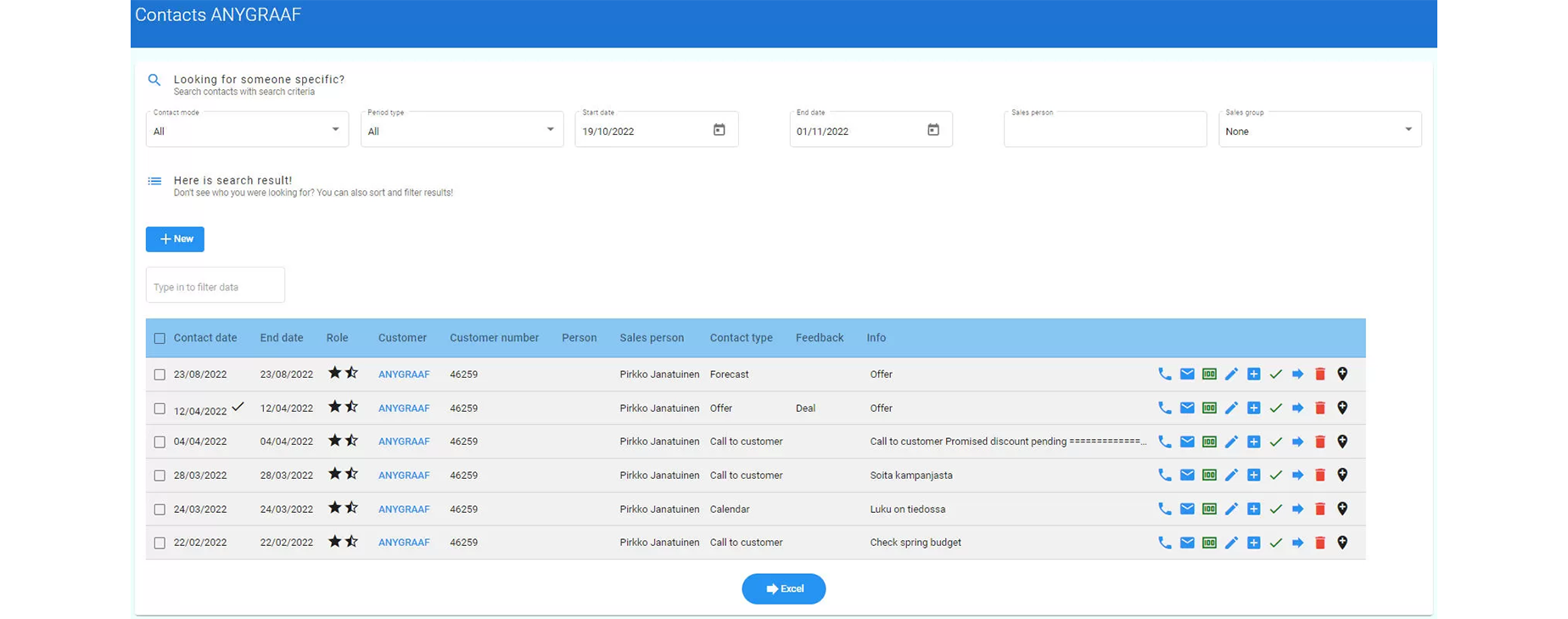 Also gathers the measures together The contact list shows the date, contact status, last contact date, customer (link to customer information), customer number and the customer's contact person, if the person has been selected for contact. In addition, the seller who owns the contact, the contact type and possible feedback to the contact are displayed, for example call, did not answer, offer, accepted, etc. The info field contains the free-form text that has been entered for the contact.