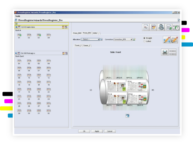 Press Register is a product which can scale, rotate, mirror and shift the final image to be exposed on the plate, in order to correct for press misregistrations. The use of NewsWay Press Register greatly improves the final print quality and minimizes press mechanical adjustment. Press Register corrects much more than simple FanOut.